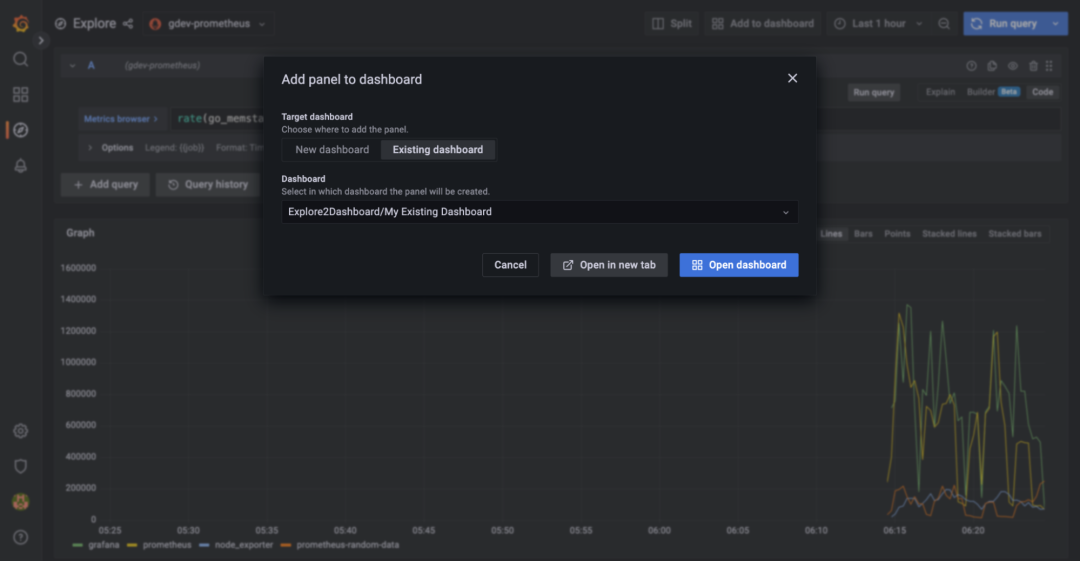 Grafana 9.0 公布了一个新的 Explore 到仪表盘的工作流程,允许你直接从 Explore 模式中创建面板或仪表盘。当一个复杂的查询起作用时,你不再需要费力地复制它或重写它到一个新的仪表板。相反只需指示 Grafana,通过点击一个按钮(见下图),就可以直接从 Explore 创建一个新的面板 / 仪表盘或添加到一个现有的面板中。