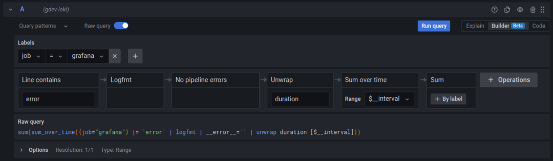 在下图所示的 Loki 查询生成器中,你可以添加和编辑标签过滤器、解析器和函数等。Loki 查询生成器支持上面列出的 Prometheus 查询生成器的所有功能,包括 Explain 模式,以及在 Code 模式和 Builder 模式之间切换的功能。
