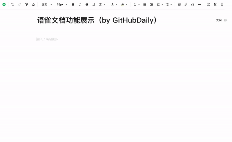 斜杆 /快捷键支持快速插入视频、图片、附件、代码块、思维导图、Emoji 表情等诸多内容,还可以添加日历、投票、打卡等各种互动程序。