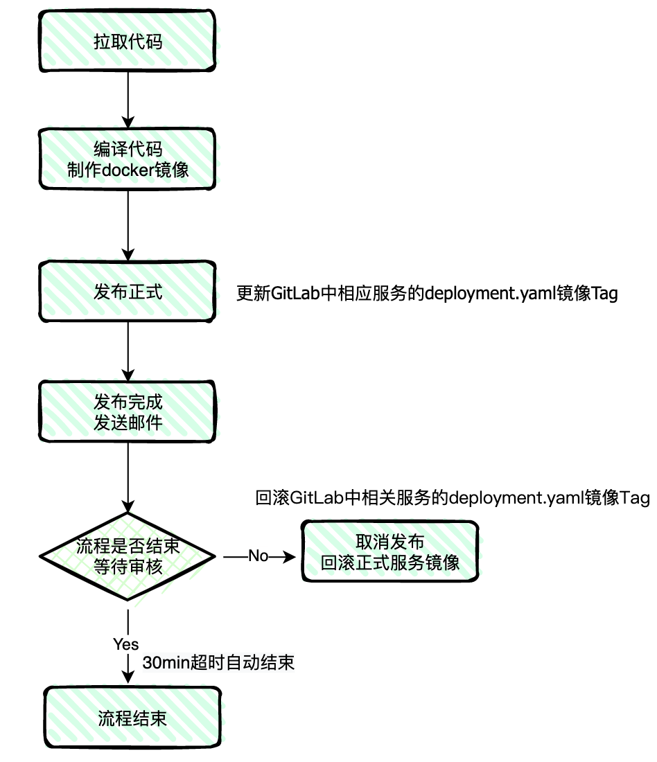 正式环境发布之后(即流水线最后一步),可以点击“终止”回滚到上一个镜像版本(一般在新版本测试不通过的情况下点击“终止”),如果 30 分钟内没有点击,或者点了继续,本次发布流程将结束。