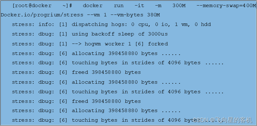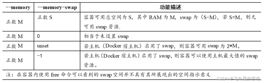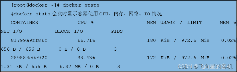 默认情况下,用户可以设置一个0~100的值,代表允许内存与交换分区置换的比例。设置一个内存使用的 soft limit(非强制性限制),如果 Docker 发现主机内存不足,会执行 OOM 操作。这个值必须小于 –memory 设置的值。宿主机会在内存不足时,随机关闭一些进程,而该参数会保护容器进程不被关闭。只有通过设置 -memory 限制容器内存,才可以使用该参数,否则容器会耗尽主机内存,而且导致主机应用被终止。❗注:--memory-swap 只有在设置了 -memory 时才有意义。使用 Swap 允许容器在耗尽所有可用的内存时,将多余的内存需求写入磁盘。两者的关系如表所示。以上两个参数默认值都为 -1,即对容器使用 内存 和 Swap 没有限制。下面使用 progrium/stress 镜像来介绍如何为容器分配内存,该容器可以模拟进行压力测试。示例代码如下:以上示例运行了一个容器,分配可用最大内存为 300MB,可用 Swap 为 100MB。–vm-bytes 280M 参数表示每个线程分配 280MB 内存。可以看到系统不断地给容器分配内存、释放内存,一直循环。由于使用的内存 380MB,在最大使用量(400MB)之内,容器正常运行。从以上示例中可以看到,容器使用的内存超过了限额,容器里的进程被终止掉了,其中,signal 9 就是终止进程信号,最后容器退出。如果在创建容器时仅指定 -m 参数,不设置 -memory-swap 参数,那么 -memory-swap 默认是 -m 的两倍,示例代码如下:在以上示例中,容器最多使用 100MB 内存和 100MB Swap。主机上的进程会通过时间分片机制使用 CPU。CPU 用频率来量化,也就是每秒执行的运算次数。为容器限制 CPU 资源并不是改变 CPU 的频率,而是改变每个容器能使用的 CPU 时间片。理想状态下,CPU 应该一直处于运算状态,并且进程的计算量不会超过 CPU 的处理能力。Docker 允许用户为每个容器设置一个数字,代表容器的 CPU share(共享),默认情况下每个容器的 share 值是 1000。这个 share 值是相对的,本身并不能代表任何确定的意义。当主机上有多个容器运行时,每个容器占用的 CPU 时间比例为它的 share 值在总额中的比例。例如,主机上有两个一直使用 CPU 的容器(为了方便理解,不考虑主机上运行的其他进程),其 CPU share 都为 1000,那么两个容器 CPU 使用率都是 50%;如果把其中一个容器的 share 值设置为 500,那么两者 CPU 的使用比为 2:1;如果删除 share 值为 1000 的容器,剩下来容器的 CPU 使用率将会是 100%。Docker 为容器设置 CPU 资源限制的参数是 -c 或 –cpu-shares,其值是一个整数。运行两个容器 test01 与 test02,并设置 CPU 权重,示例代码如下:以上示例中分别为 test01 与 test02 设置 CPU share 为 1000 与 2000。接着,使用 docker stats 查看容器占用 CPU 情况,示例代码如下:从以上示例中可以看到,两个容器 CPU 的使用占比约为 2:1,与先前设置的 share 值相吻合。此时将 share 值为 2000 的 test02 容器暂停,再来查看 CPU 使用情况,示例代码如下:设置 CPU 资源限制还可以使用 –cpuset-cpus 参数,它能够指定容器使用某一颗 CPU。这里使用 CPU 测试镜像 agileek/cpuset-test 进行测试,其功能是将 CPU 用满,示例代码如下:使用宿主机 top 命令查看 CPU 使用情况,可以看到 CPU1 已经被占满,而 CPU0 没有受到影响,如图所示:Block IO 表示磁盘的读写,Docker 可以用配置 bps(每秒读写的数据量)和 iops(每秒读写的次数)的方式限制容器对磁盘读写的带宽。下面介绍限制 bps 与 iops 的参数。