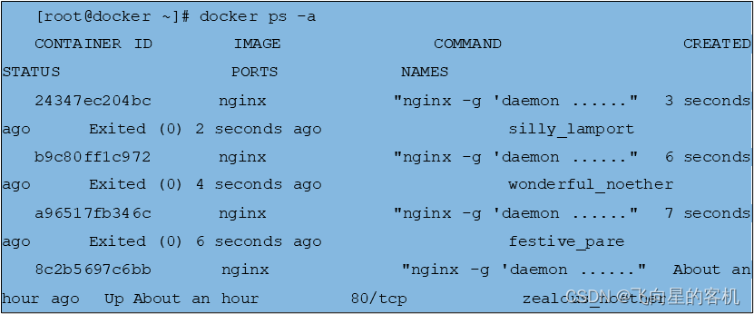 - docker kill 执行时,不论容器是什么状态,在运行什么程序,直接执行 kill -9 指令,强制终止容器。