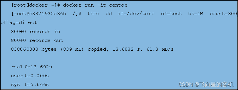 默认情况下,所有容器对磁盘读写的带宽是相同的,通过配置 -blkio-weight 参数的值(10-1000)可以指定容器 Block IO 的优先级。–blkio-weight 与 -cpu-shares 类似,默认值都是 500。下面运行的两个容器 test01 与 test02,其中,test01 读写磁盘的带宽是 test02 的两倍。从以上示例中可以看到,容器 test01 的相对权重值是 800,而 test02 的相对权重值是 400,故 test01 读写磁盘的带宽是 test02 的两倍。下面运行一个容器,限制其对 /dev/sda 写入的速率不高于 20MB/s。因为容器文件系统在宿主机的 /dev/sda 上,在容器中写文件相当于对宿主机的 /dev/sda 进行写入操作。以上示例运行了一个 CentOS 容器,并限制其写 /dev/sda 的速率为 20MB/s。从以上示例中可以看到,设置了写入限制的容器,写入速率为 19.4MB/s,没有超过写入限制的 20MB/s。作为对比,下面运行一个不限制写入速率的容器,示例代码如下:以上示例中,一个不限制读写速率的容器,写入速率是 61.3MB/s。其他参数使用方法与之类似,大家可以自己尝试做一下🤗。这两篇文章通过大量的实验讲解了操作 Docker 容器的方法,包括进入、停止、删除容器等,以及容器各种状态之间如何转换;最后介绍了 Docker 容器的资源限制,包括 限制内存、CPU、BLOCK IO 三种方法。- END -