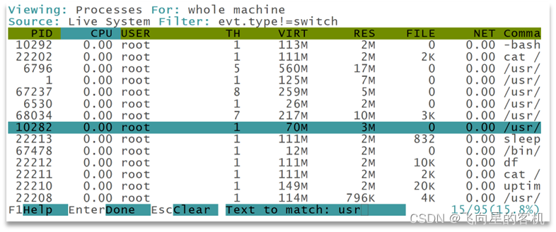 为方便用户管理,Sysdig 还支持搜索功能,通过 Ctrl+F 组合键即可启动该功能,再输入关键字即可查询。此处关键字以 usr 为例,如图所示。