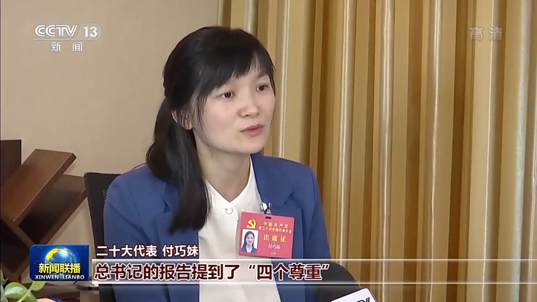 二十大代表 付巧妹:总书记的报告提到了“四个尊重”,我是深有感触,这点对我们科研人员,尤其是基础研究的人员来说是非常受鼓舞的。我们能够可持续地做很多工作,得益于这几年党和国家对我们科研人员的重视和支持。