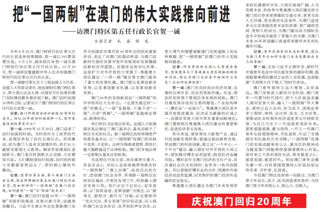 澳门回归祖国20周年之际,人民日报记者采访了澳门特别行政区第五任行政长官贺一诚。