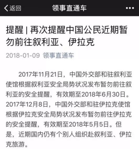 “再次提醒中国公民近期暂勿前往叙利亚、伊拉克”——1月9日晚上,外交部领事司公众号“领事直通车”发布提醒。