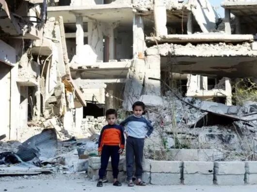 资料图片:2017年10月28日,在叙利亚中部城市盖尔亚廷,两名儿童站在被战火摧毁的居民楼前。
