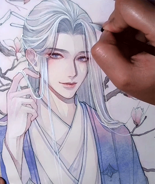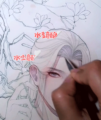 ▲白发主要用蓝灰紫来画,底色水要多。