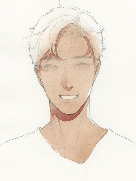 ▲肤色用土红色加水直接平涂,阴影用肤色加入一点玫红来画,再根据光影混入一些蓝色。