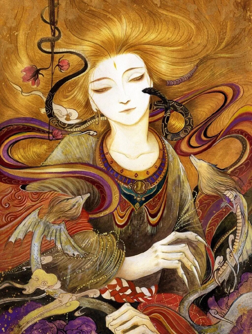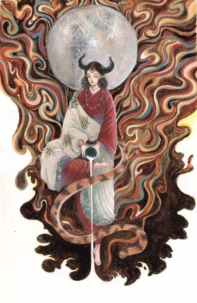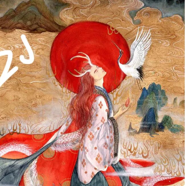 她的画就是有这样的魔力。用色彩讲故事,把看的人轻易地带入到一个奇异绚丽的国风世界里。