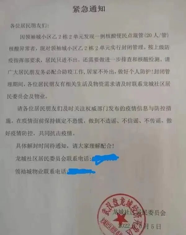 据悉,因常规核酸检查过程中出现异常,盘龙城两小区接连发布紧急通知,对相关楼栋进行封控处理。