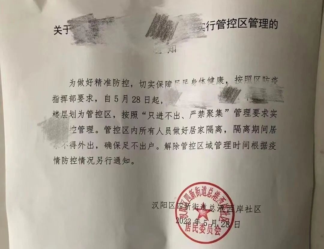 据家长分享,28日,四新街道总港西岸社区纽宾凯蜜城10栋1单元5层楼层划为管控区,“只进不出,严禁聚集”。