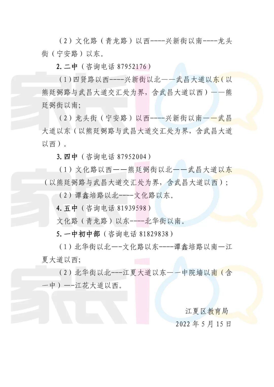 3.2022年江汉区义务段公办学校入学服务范围安排,最终入学安排以江汉区人民政府发放的《义务教育入学通知书》为准。具体相关事宜可拨打江汉区教育局电话咨询,联系电话:82833913(小教科),82834883(中教科),82807937(信访)