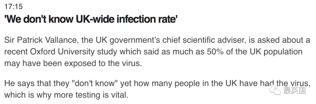 面对牛津大学的研究,几分钟前,英国政府首席科学顾问Patrick在官方媒体会上回应:“有多少人感染新冠,目前我们还是未知的。”