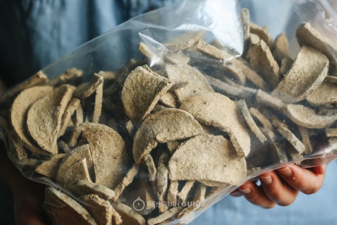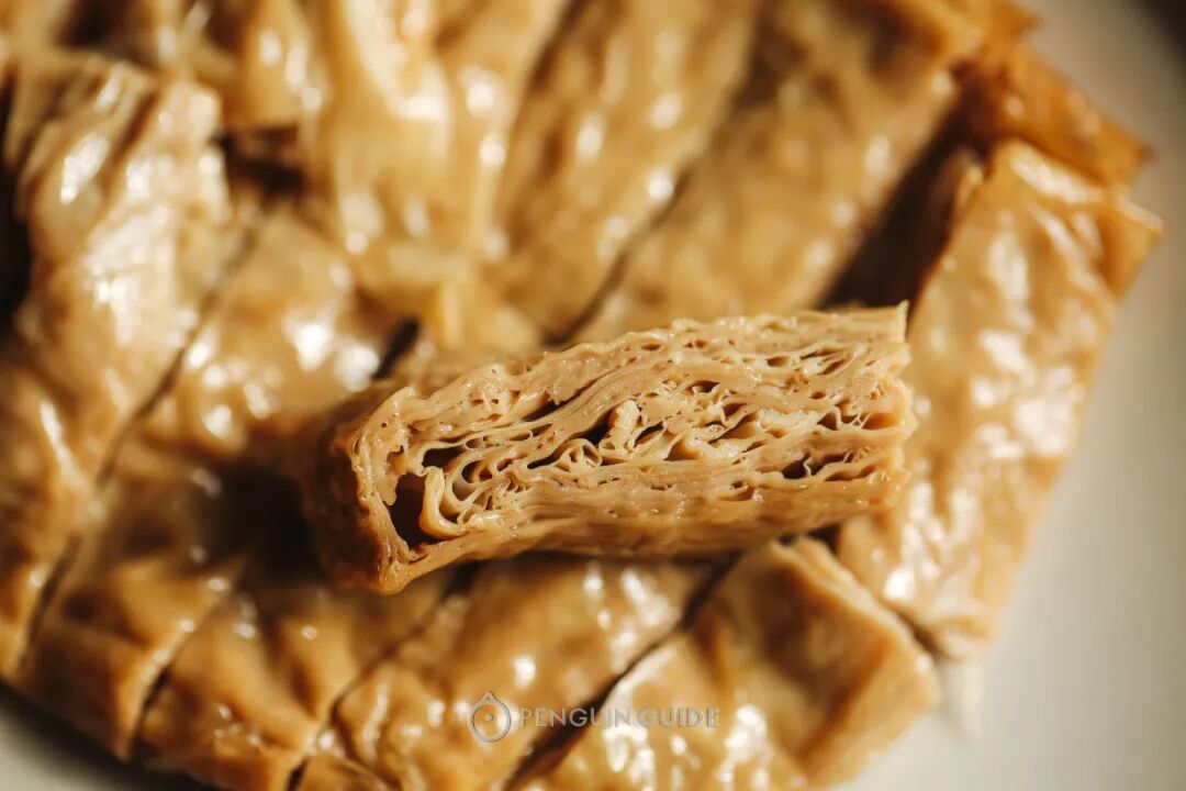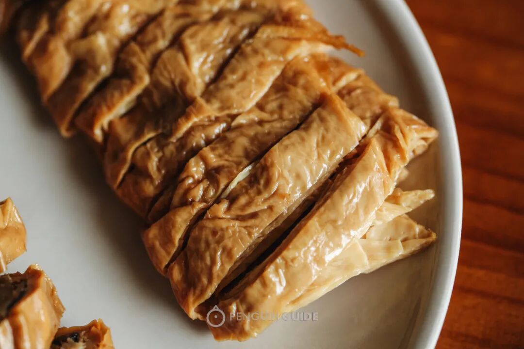还有一种宝藏吃法:复煎!因为本身带油,所以不用放油,切小条中小火煎一煎,就是超级酥脆的小零食~在不少熟食店,这种豆腐衣还有裹馅的版本,经典代表如杭州卷鸡,塞得很饱满,一大大大口的满足,在嘴里如百花齐放~如果觉得煎过的豆腐衣油腻,可以选择居士素食的素八宝鸭,厚豆干作为外皮,未经过油煎:淘宝可搜到这家素食工坊,在上海有工厂,有时会去寺庙里摆摊售卖,味道和口感都不输其他老字号。居士素食还有一款粽香素火腿,也是豆腐衣做的,口感很弹,确实比火腿肠好吃!微微甜,还有隐约的芝麻香气:青岩自古是军事重镇,对食物的要求就是:能囤得越久越好,所以诞生了一系列易于保存的豆制品:看这又干又脆的豆腐,内部的镂空组织很特别,并非经过油炸,而是点卤、压制、自然晾晒的结果。泡发很快,切条炒炒,吸收油分后,口感非常絮软,有点像油面筋,但又更加轻盈,是更接近棉花糖一般的空气感:这是豆浆在锅底烙成的一层皮,看这纹路,就能想象蛋白质紧贴锅壁、水分蒸发成气泡咕噜咕噜散去,仿佛海陆变迁的痕迹:千张/百叶,在东北叫干豆腐,尤以嫩薄出名,你以为你撕开了一张,其实可能撕开了两三张