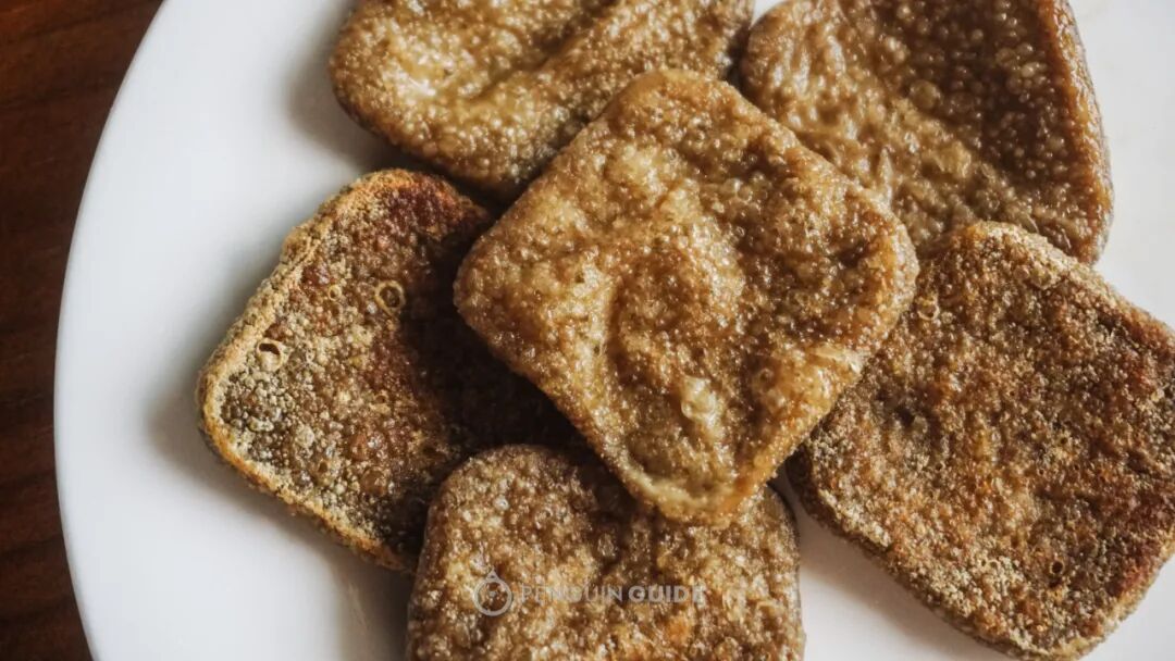 五花肉煸出油脂,下青菜炒软,然后加水,放入提前泡好的豆渣粑,料酒酱油提鲜,小火慢煮,豆渣变软而不散,逐渐入味。三样食材吸收了彼此的鲜味精华,是农家里泛着山野气息的暖暖炊香了~而且都巨能吸汤汁!买上一大袋,一人食或者朋友聚餐,小火锅随心放:不管是制作工艺还是口感,普宁豆干都算豆腐界一朵奇葩:有着老豆腐的皮,内里却很嫩滑。更特别的是,能明显尝出新鲜豆浆那种自然的甘甜:可能是最适合煎/炸的豆腐:外皮酥脆,内里的嫩滑丝毫不受影响(记得配蘸水:韭菜+盐水)