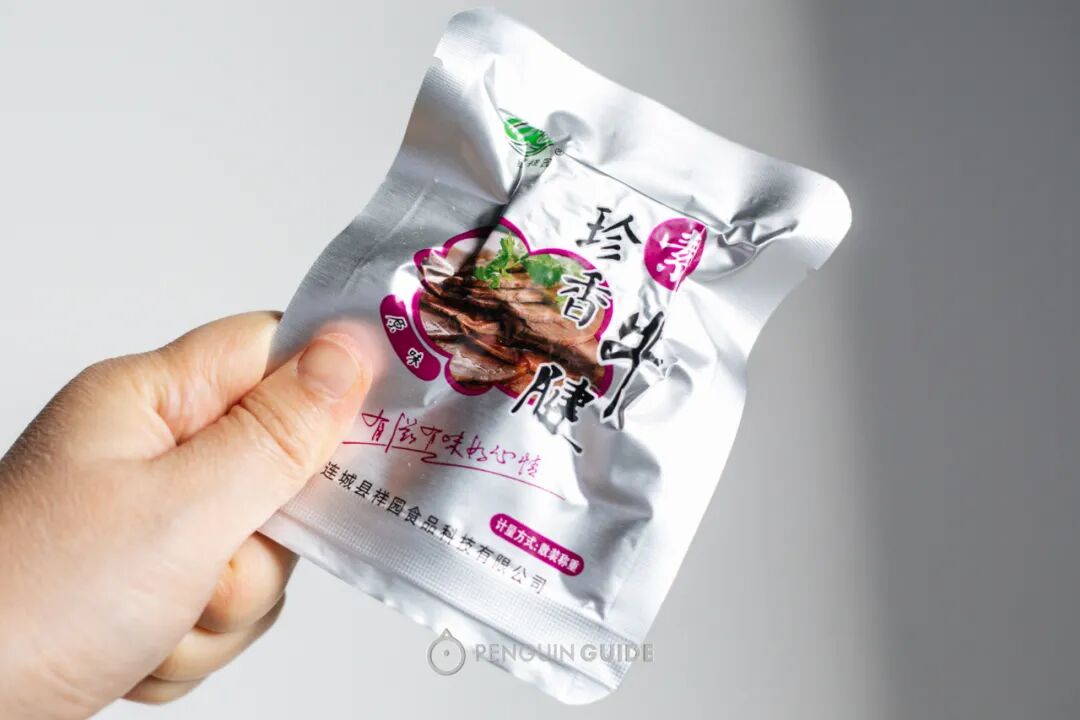 还有五香油豆皮:简直是超大号百叶结,一口很扎实,但质地很嫩,嚼开了也没有一嘴渣渣的感觉。素肠,则是内部组织更紧实的豆卷,光滑横截面仿若火腿,与江浙沪的素鸡类似:但东北有增味版:镶嵌了胡萝卜丁+香菇丁,整体味型更加丰富了!素肠推荐虹豆香,包装朴实,但其实是辽宁葫芦岛的物产名牌——这个地方的干豆腐在清朝中末年间就相当出名,来赶集的人都一定要吃上一口。此乃传说中很火的仿真肉,原料其实很简单,就是豆粕:大豆提取豆油之后剩下的渣——低脂,高蛋白!豆粕经过各种工艺蹂躏之后,整型成纤维状的拉丝蛋白干,说质地像肉其实很勉强,但确实是个很有趣的豆制品:泡发后用酱油腌一腌,油煎一煎,口感柔软而不失韧性,非常特别:自己做的最干净,还有着最纯粹的豆味,不像市面上不少拉丝蛋白小零食,添加过多,还普遍有种油耗味:豆浆表面煮出的那层皮,挑起来晾干,就是腐竹——非常自然的一种食物,但市面上很多会抹防腐剂/漂白剂/过量的盐,甚至还会掺淀粉,而最完美的配料表应该只有黄豆+水。