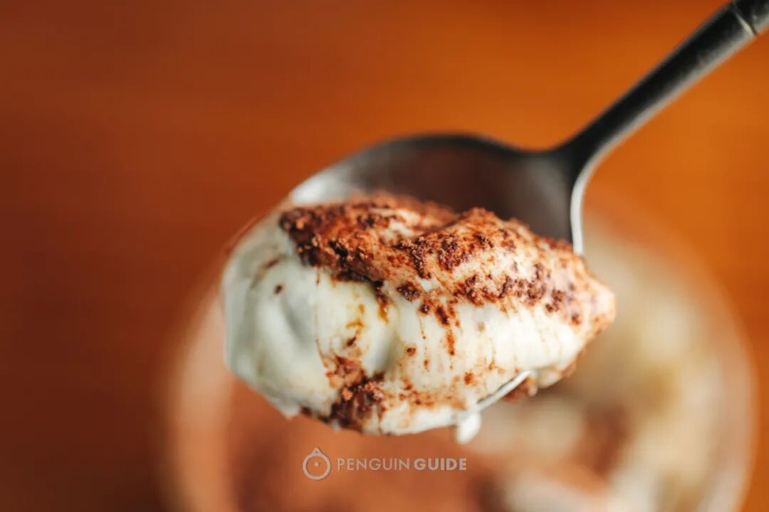 吃前撒上一层可可粉。要比一般的提拉米苏更清爽,含在嘴里,温婉的豆香慢慢扩散开来,可可粉与咖啡的微苦能将这份甜点层次感衬得更鲜明!