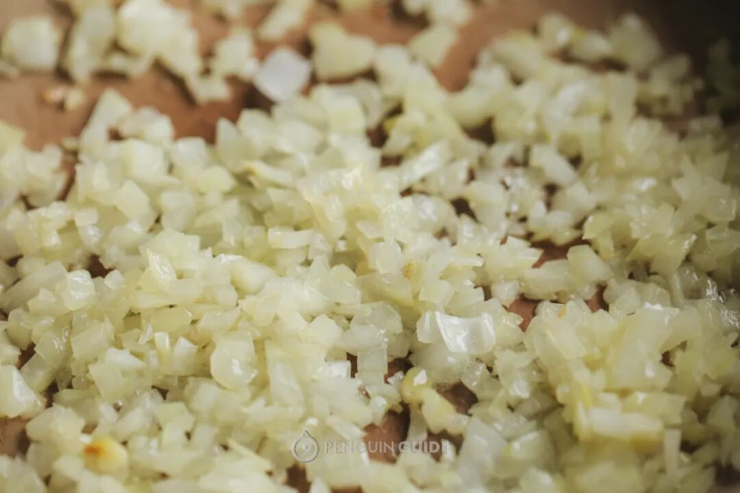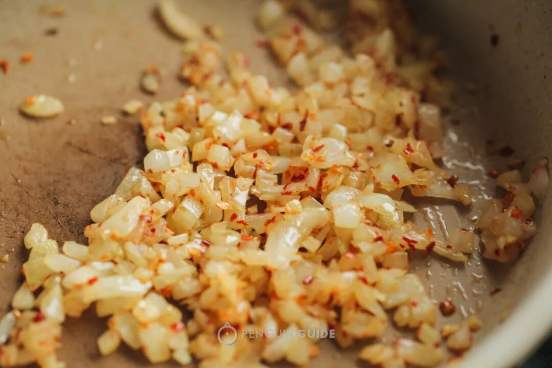 洋葱需要提前炒香,加一小勺油中火炒至半透明。炒过的洋葱少了辛辣味,多了几分清甜和香气。