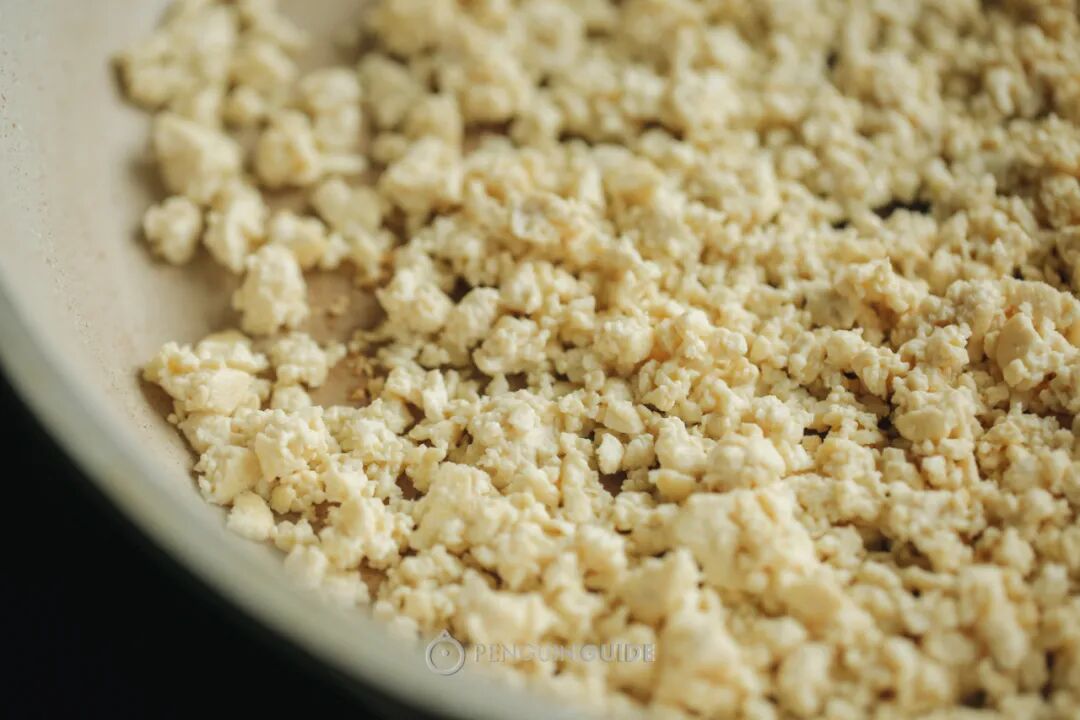 不用洗锅,也不用另外拿个新锅!继续炒一份没有调味的豆腐末。(豆腐末的部分和上面两个菜谱几乎一样,碾碎炒干爽就好)