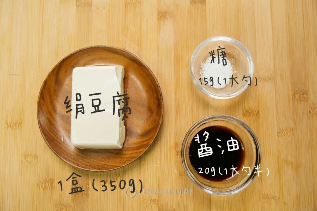 原材料就只有豆腐、酱油、糖。我们用了绢豆腐,质地最嫩,无需焯水,豆浆的香气非常明显。