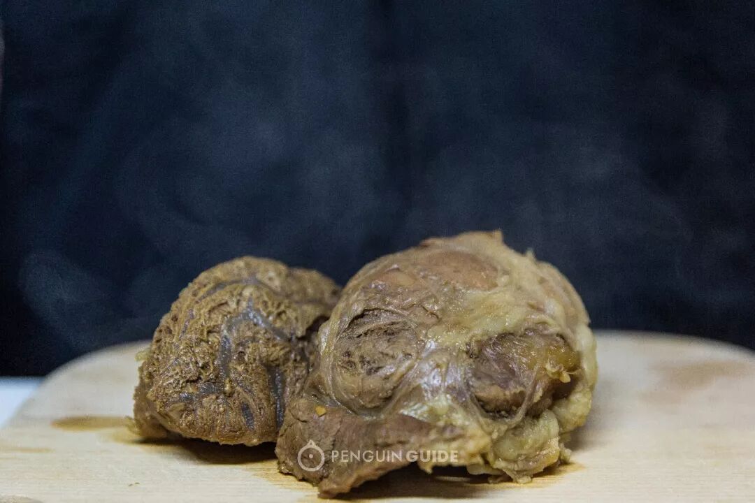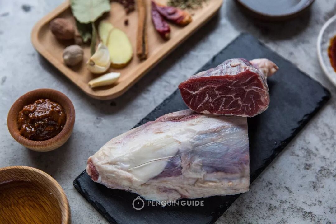 前牛腱筋比较多,吃起来筋和肉相互交裹,能感受到筋弹牙肉顺口的丰富层次感,后牛腱肉多筋少,可以畅快地大口吃肉。