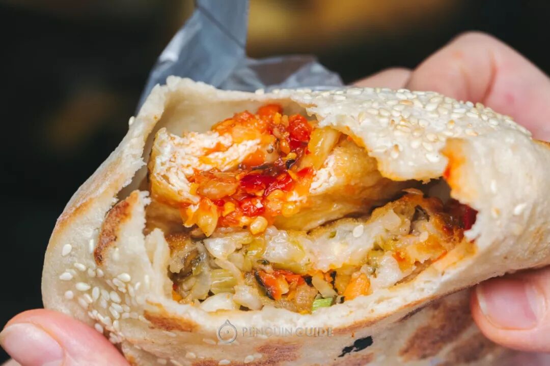 下午饿了,买一只烧饼夹油炸粿臭豆腐。用一张芝麻烧饼,把香香的油炸粿和臭臭的豆腐包在一起,再用小勺子戳开一个洞,往里灌辣椒,这一波三折的食材组合,太有趣了: