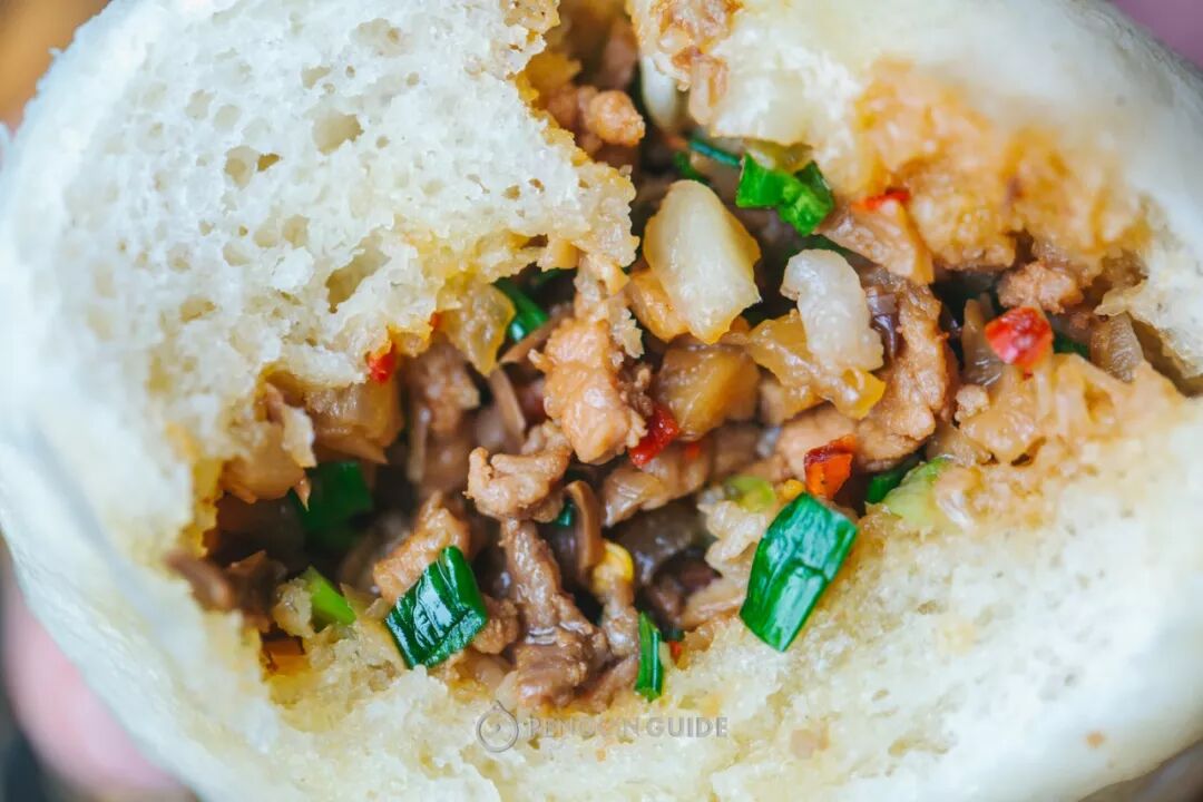 馒头则用酒酿发酵,雪白松软,弹性极好。上锅蒸熟,趁热在侧面掏洞,然后往里塞馅料。
