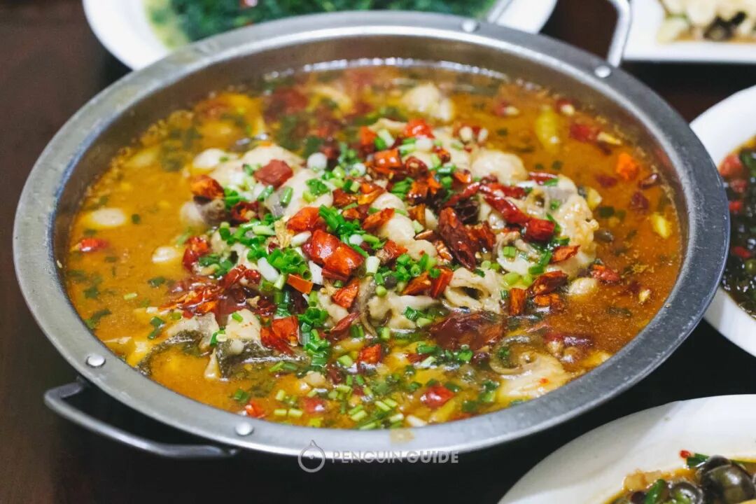 鱼身拿来烧麻辣鱼。鱼头鱼骨炒出汤底,鱼肉片微微汆烫,铺满干辣椒,浇一勺滚热的油,哗啦一声,好不过瘾!