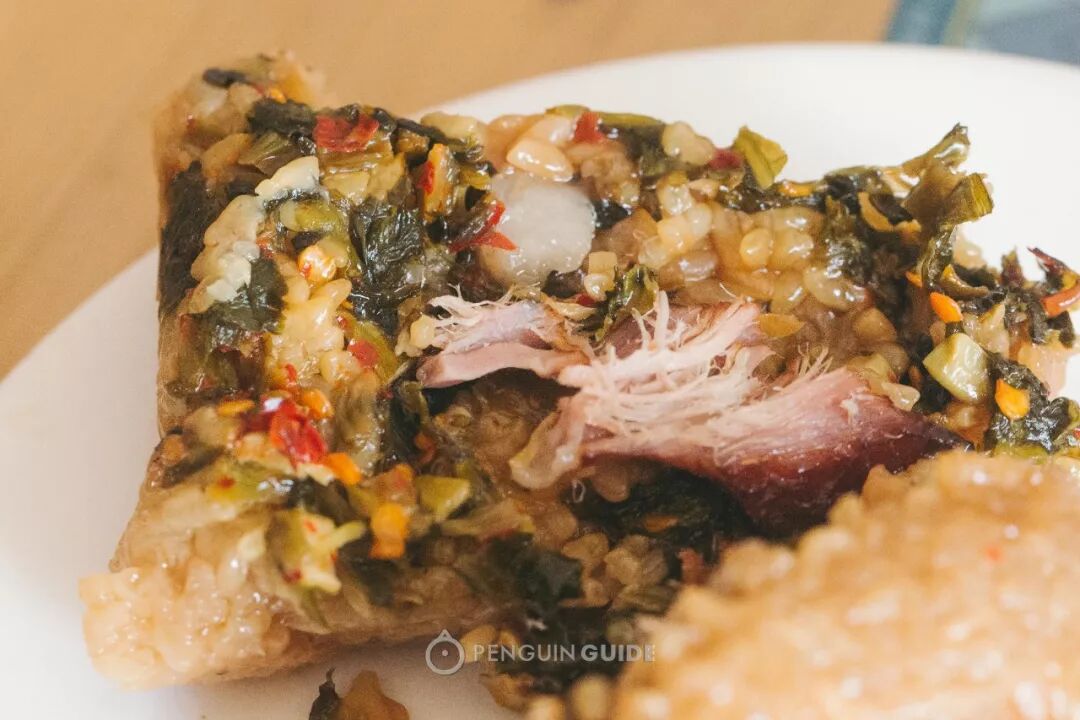 一种是腌菜辣粽。黄绿色的雪菜鲜咸满满,藏了一大块后腿肉,油脂莹润,瘦肉嫣红,辣椒星星点点,有点美~