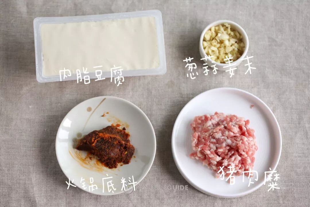 材料依然非常简单:葱姜蒜切末,50g猪肉馅(稍微肥一点),火锅料包,一盒内脂豆腐。