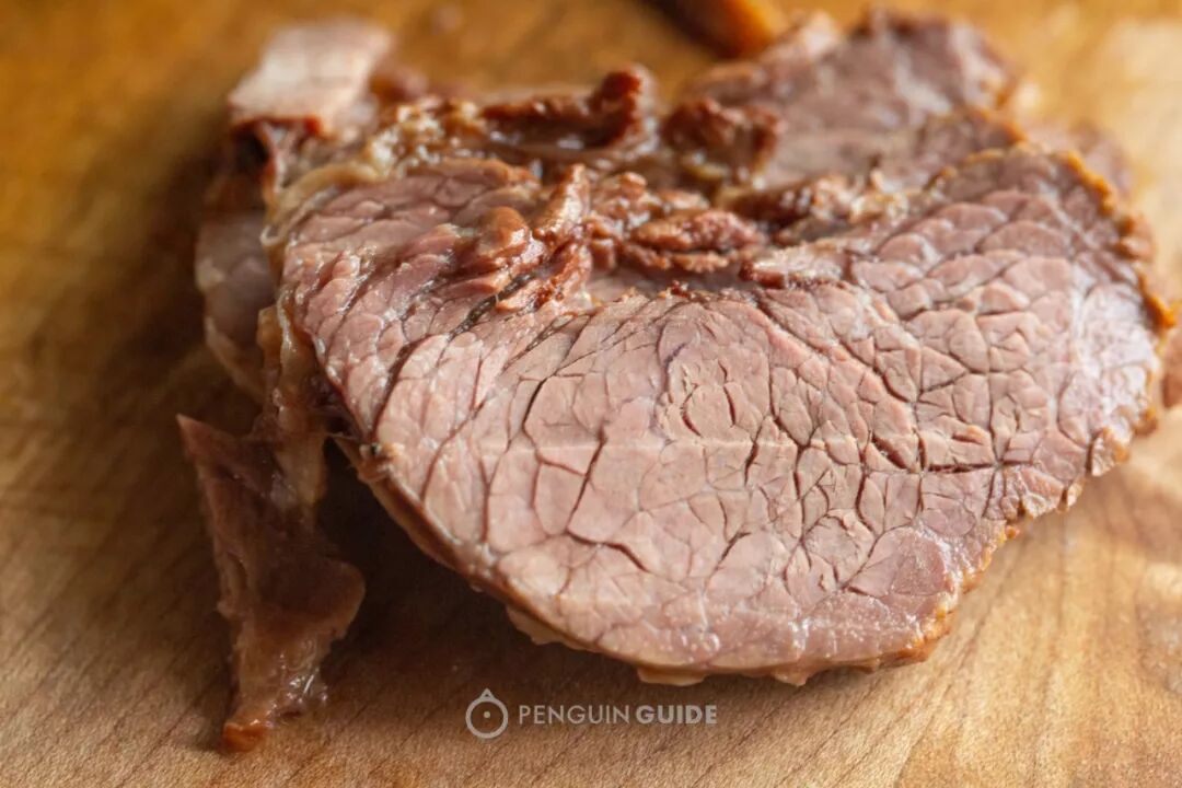 最后泡一夜,拿出来切片,就收获这么一条纹理丝丝入味、紧而不柴的卤牛肉了。