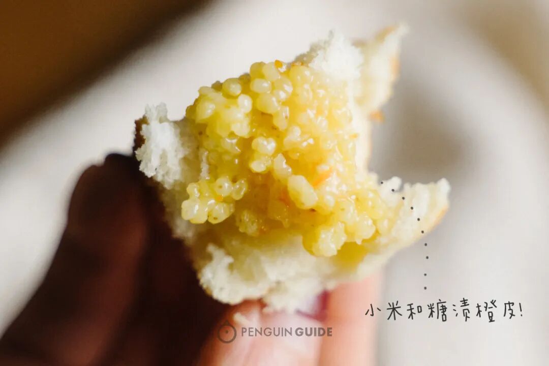它像个温柔内敛的少女,外层是柔嫩的表皮,有淡淡的黄油香气,不腻。里面是黄澄澄、黏丝丝的小米,甜,软,还有糖渍橙皮的甜蜜。