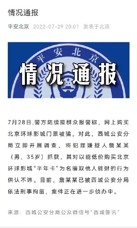 7月29日,部分游客在某些平台购买环球影城半年卡被骗的消息在多个平台疯转。有媒体从北京环球度假区求证后获悉,北京环球影城已将相关信息向公安机关报告。