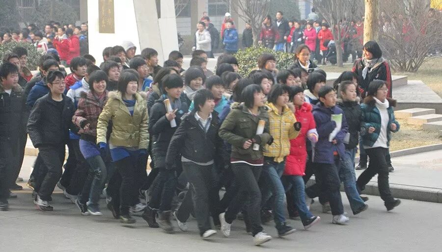 ▲ 衡水中学的一个班级在跑操,有学生手里拿着复习资料。 © Owuawb