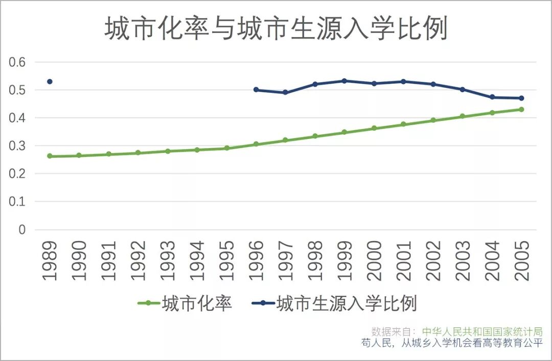 ▲ 对比城市化率和城市生源入学比例可以看出,至少在1989-2005年间,占总人口比例更少的城市学生获得了更多的高等教育机会。