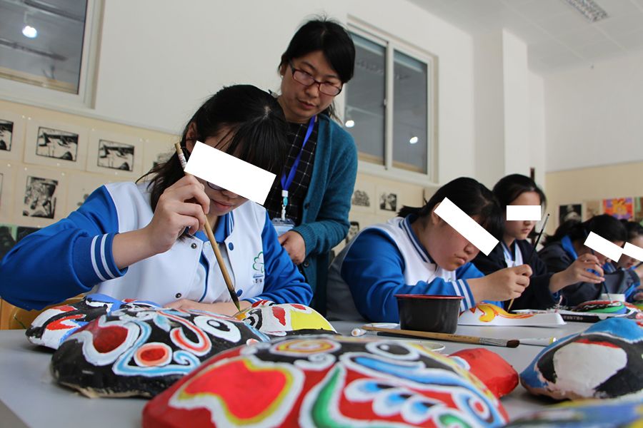 ▲ 2016年4月,山东即墨,一所中学的学生在画脸谱。学校开办了捏泥塑、画脸谱等“兴趣课程”。 © 图虫