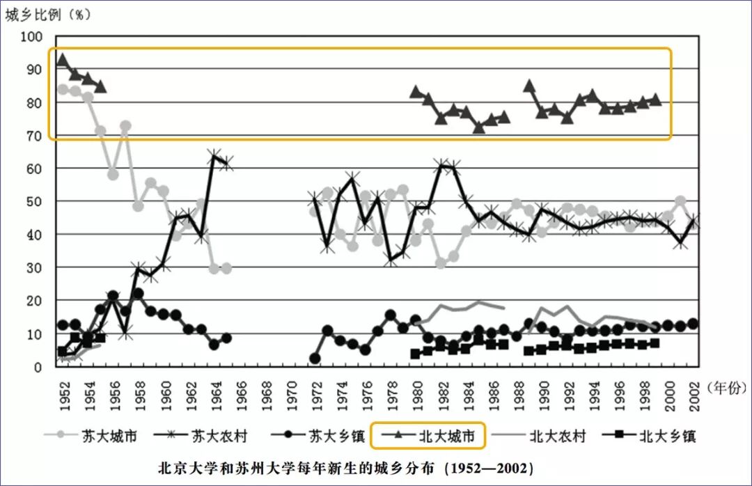 ▲ 学者梁晨等人曾研究1952-2002年间北京大学和苏州大学学生学籍卡片,分析得出两高校的生源比例。其中北京大学城市学生比例一直处于绝对优势。(因研究数据不同,与杨东平引用数据有出入。)