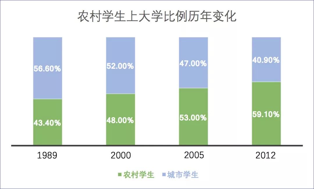 在“补偿政策”的支持者看来,弱势群体在大学生中的比例上升,就意味着教育公平得到改善。最近二十年,中国在这方面取得了长足的进步。杨东平承认:“在90年代末大学扩招之后,农村学生上大学的比例的确明显提升。1989年农村学生的比例为43.4%,2003年农村学生与城市学生的比例持平,2012年农村学生比例已经达59.1%。”考虑到中国城乡人口结构的变化,这一趋势就更为明显。