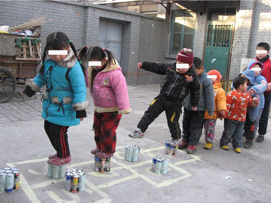 ▲ 孩子们把“梅花桩”和“跳房子”结合在一起游戏。 © 四环游戏小组