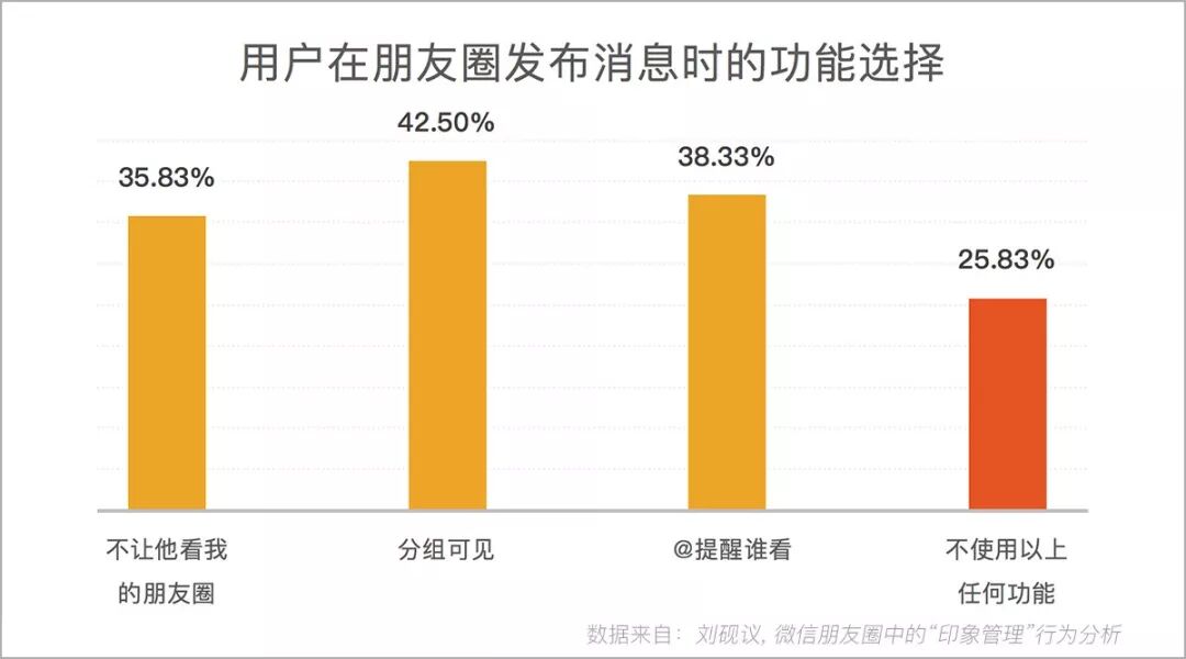 朋友圈的分组可见功能,被戏称为“第五大发明”。通过此功能,用户可以选择朋友圈内容的观看受众。如果把每条朋友圈的发布当作是一场自我呈现的演出,那么设置“谁可以看”便是一个挑选“观众”的过程。表演者依据自己想呈现的不同形象,选择在不同观众面前表演不同剧目。因此,在“家人可见”的朋友圈里,表演者可能倾向于表现得乖巧孝顺;在“上级可见”的分组中,他可能是一个拼命三郎。▲ 另外在《关于微信朋友圈的印象管理策略的社会调查访谈记录》中,一位受访人说:“很不爽……过年了,个个(亲戚)都要我的微信。我现在通常不发纯文字了,因为没法分组(2016年时,“朋友圈分组”必须以图片形式为前提),他们也可以看到。只有发图片,我要给我的好友看,我会设置的,这样亲戚就可以没法看到。超级郁闷的。”