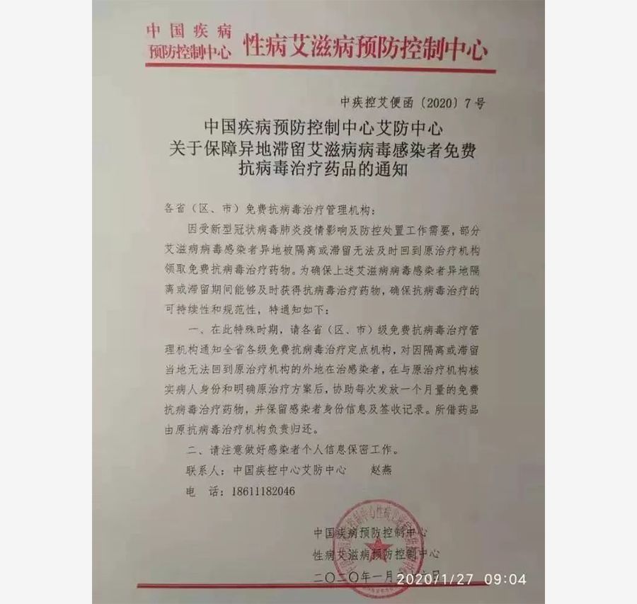 1月26号,中国疾控中心出台了全国性的领药方案,保障异地滞留的HIV感染者领取药物。但在此之前我们就联系了省疾控,省疾控出台了政策,因为湖北的封城,感染者可以找当地疾控或定点医院异地取药。