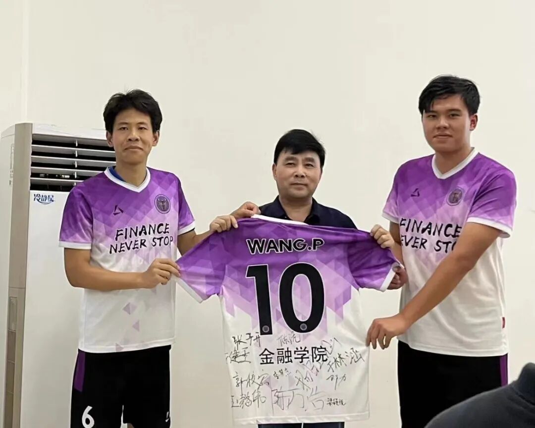 接下来,金融足球队20级、21级队长郭凯铭、郑霁川邀请教师代表——汪平书记担任球队特别顾问,并代表球队向汪书记赠送了印有2022届全体毕业生签名的特别版10号球衣!汪书记鼓励大家传承金融足球精神,不断拼搏,勇攀高峰,再创佳绩!