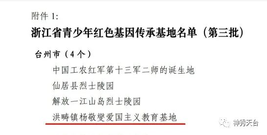 近日,共青团浙江省委员会发布《关于命名第三批浙江省青少年红色基因传承基地的通知》,天台县洪畴镇杨敬燮爱国主义教育基地入选。