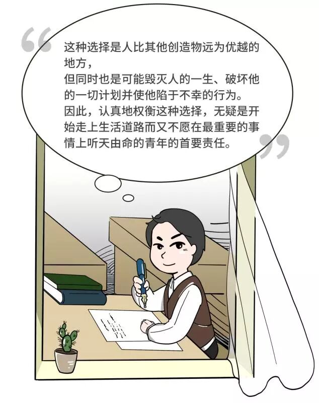 “这种选择是人比其他创造物远为优越的地方,但同时也是可能毁灭人的一生、破坏他的一切计划并使他陷于不幸的行为。因此,认真地权衡这种选择,无疑是开始走上生活道路而又不愿在最重要的事情上听天由命的青年的首要责任。”