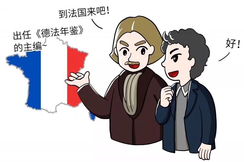 新婚旅行完后,马克思的朋友卢格邀请马克思夫妇前往巴黎,并邀请马克思一起出任《德法年鉴》的主编。马克思对法国有着特别深厚的感情,因为从小他就听父亲朗诵卢梭、伏尔泰等法国思想家的作品,而同时马克思又接受了优秀的德国古典哲学的教育和熏陶,毕竟马克思在德国生活了25年,因此,当卢格邀请马克思编写出版同时容纳法国和德国社会思想动态的刊物时,马克思几乎毫不犹豫地答应了。未曾想到,这一去,就开启了思想的华彩乐章,马克思主义从此诞生。