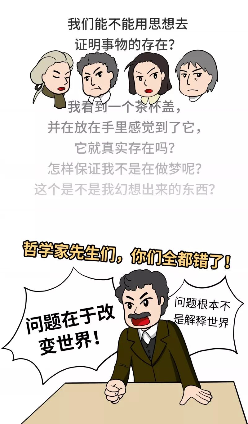 这个时候,马克思平地一声惊雷:“哲学家先生们,你们全都错了!问题根本不是解释世界,问题在于改变世界!”——就算我真的解决了用思维证明存在的难题,世界就能和平吗?人类就能解放吗?显然不能。