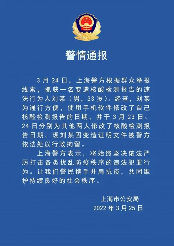 3月24日,上海警方根据群众举报线索,抓获一名变造核酸检测报告的违法行为人刘某(男,33岁)。经查,刘某为通行方便,使用手机软件修改了自己核酸检测报告的日期,并于3月23日、24日分别为其他两人修改了核酸检测报告日期。现刘某因变造证明文件被警方依法处以行政拘留。