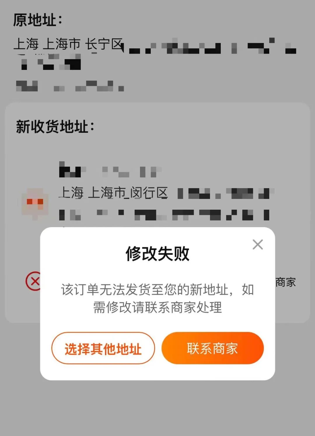 当地址选择为“长宁区”时,则可以正常发货,如果选择“闵行区”,便显示“订单无法发货”。
